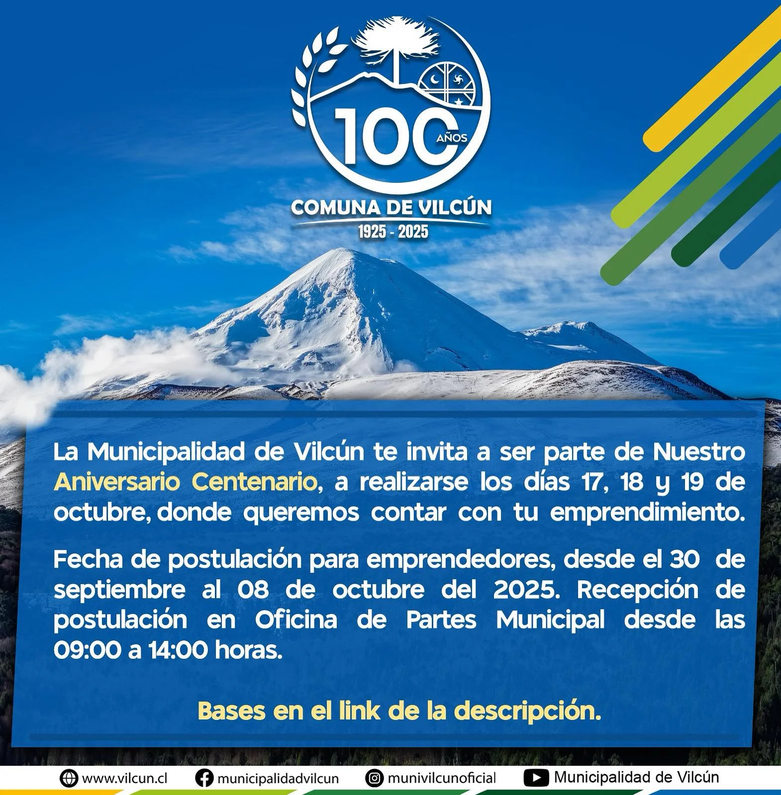 La Municipalidad de Vilcun te invita a ser parte de Nuestro Aniversario Centenario, a realizarse los días 17, 18 y 19 de octubre, donde queremos contar con tu emprendimiento.