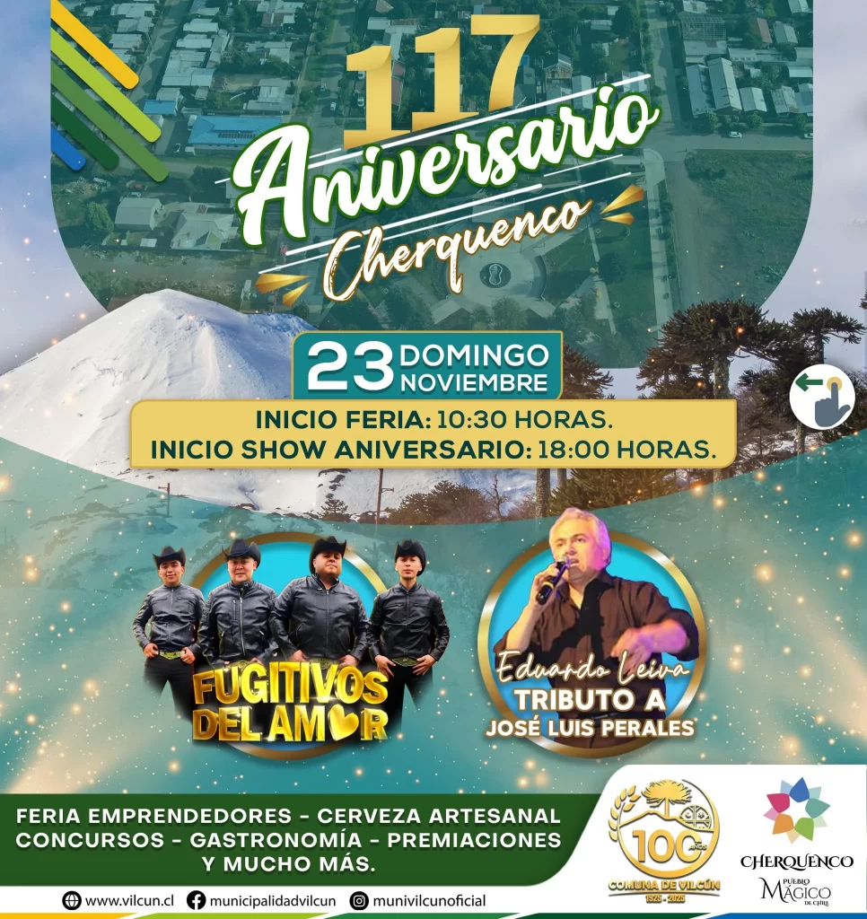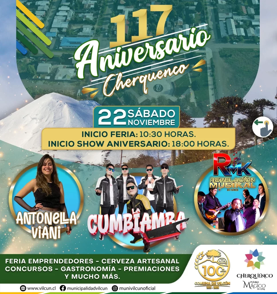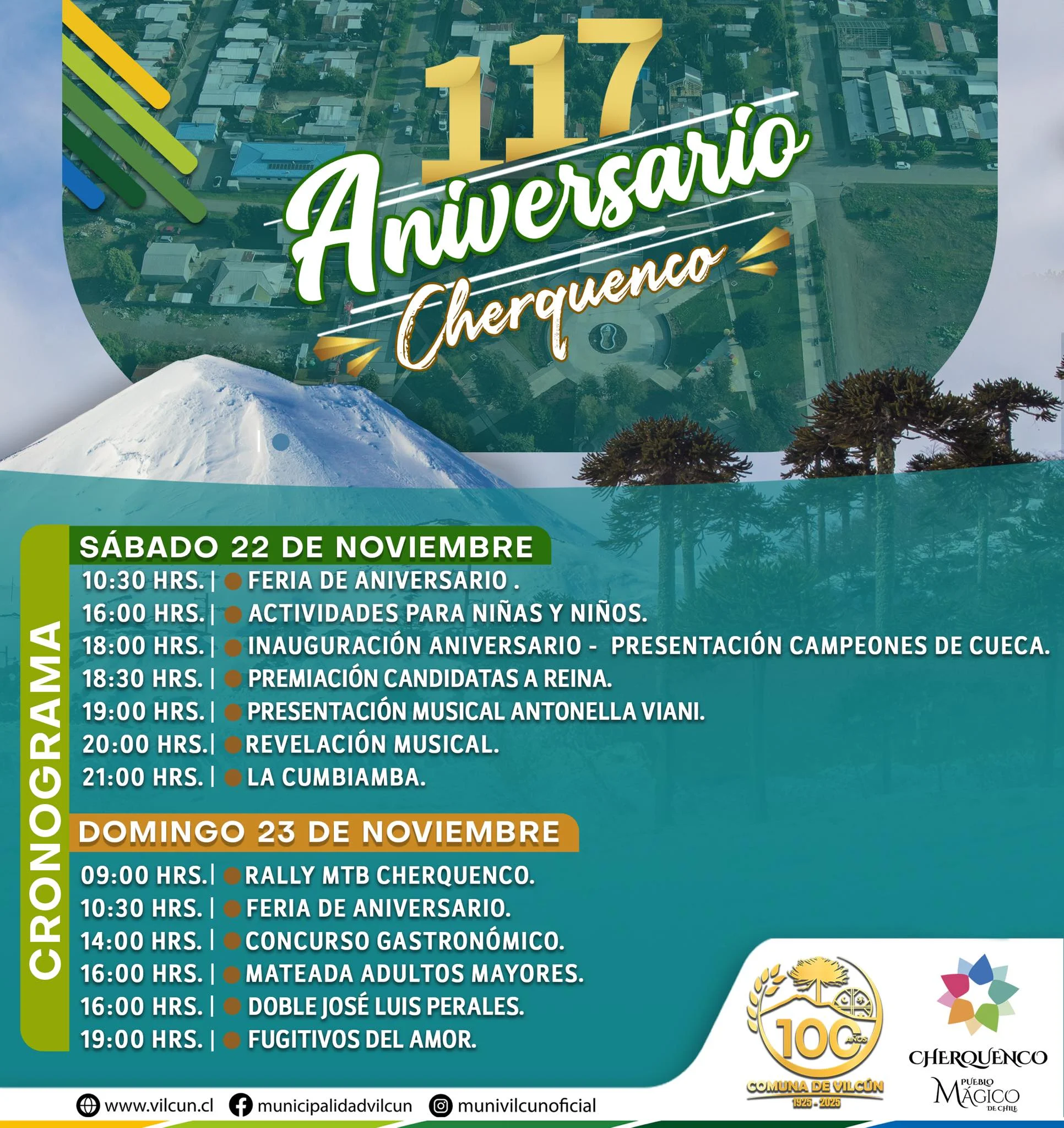 La Alcaldesa Katherinne Migueles Muñoz y el Honorable Concejo Municipal tienen el agrado de invitar a toda la comunidad y vecinos de Vilcún a celebrar a lo grande los 117 años de Cherquenco.